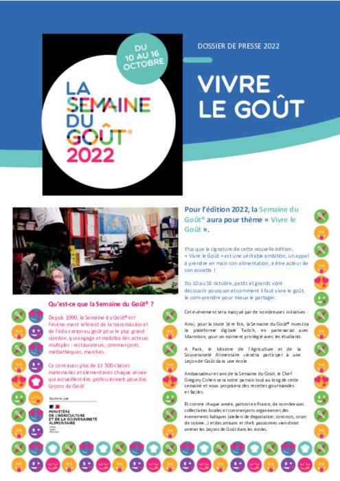 Métiers 21 septembre 2022 - 10:31 Cette année, la Semaine du Goût aura pour thème « Vivre le Goût » : Plus que la signature de cette nouvelle édition, « Vivre le Goût » est une véritable ambition, un appel à prendre en main son alimentation, à être acteur de son assiette. PDF (2 Mo) Télécharger