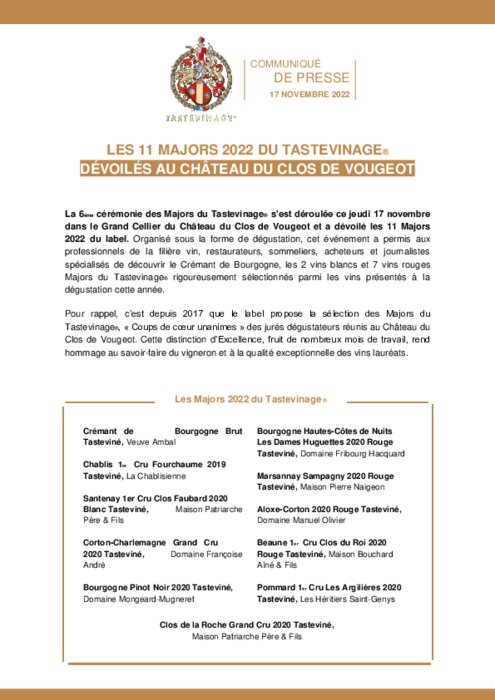 Organisé sous la forme de dégustation, cet événement a permis aux professionnels de la filière vin, restaurateurs, sommeliers, acheteurs et journalistes spécialisés de découvrir le Crémant de Bourgogne, les 2 vins blancs et 7 vins rouges Majors du Tastevinage rigoureusement sélectionnés parmi les vins présentés à la dégustation cette année.