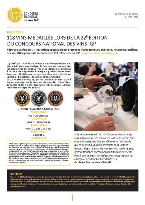 Organisé par l’Association nationale des interprofessions des vins à indication géographique, le Concours national des vins IGP récompense les meilleurs vins de la catégorie, sélectionnés à l’issue d’une dégustation à l’aveugle organisée chaque année dans une ville différente en présence d’un jury constitué de vignerons, d’oenologues, de cavistes et de sommeliers.