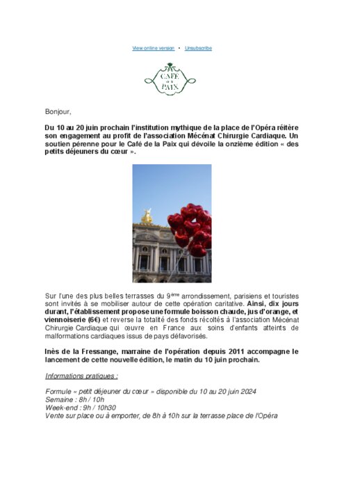 Restauration commerciale 03 juin 2024 - 14:45 Du 10 au 20 juin l’institution mythique de la place de l’Opéra réitère son engagement au profit de l’association Mécénat Chirurgie Cardiaque. Un soutien pérenne pour le Café de la Paix qui dévoile la onzième édition « des petits déjeuners du cœur ». PDF (196 Ko) Télécharger