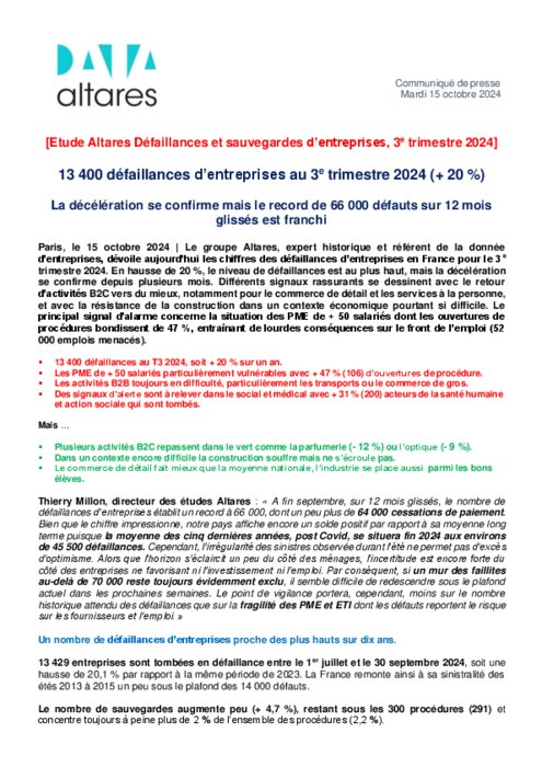 Le groupe Altares, expert historique et référent de la donnée d’entreprises, dévoile les chiffres des défaillances d’entreprises en France pour le 3e trimestre 2024. En hausse de 20 %, le niveau de défaillances est au plus haut, mais la décélération se confirme depuis plusieurs mois. Différents signaux rassurants se dessinent avec le retour d’activités B2C vers du mieux, notamment pour le commerce de détail et les services à la personne, et avec la résistance de la construction dans un contexte économique pourtant si difficile.