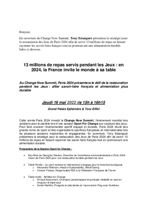 Métiers 17 mai 2022 - 12:08 Au Change Now Summit, Paris 2024 présentera le défi de la restauration pendant les Jeux : allier savoir-faire français et alimentation plus durable. PDF (109 Ko) Télécharger
