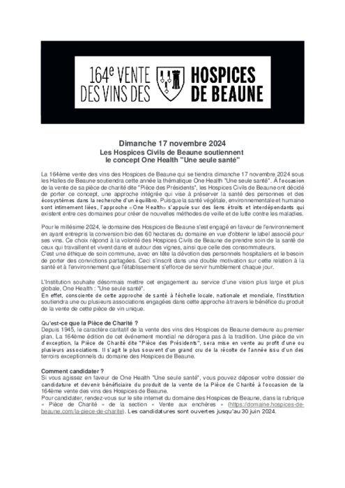 La 164ème vente des vins des Hospices de Beaune qui se tiendra dimanche 17 novembre 2024 sous les Halles de Beaune soutiendra cette année la thématique One Health "Une seule santé". À l’occasion de la vente de sa pièce de charité dite "Pièce des Présidents", les Hospices Civils de Beaune ont décidé de porter ce concept, une approche intégrée qui vise à préserver la santé des personnes et des écosystèmes dans la recherche d’un équilibre.