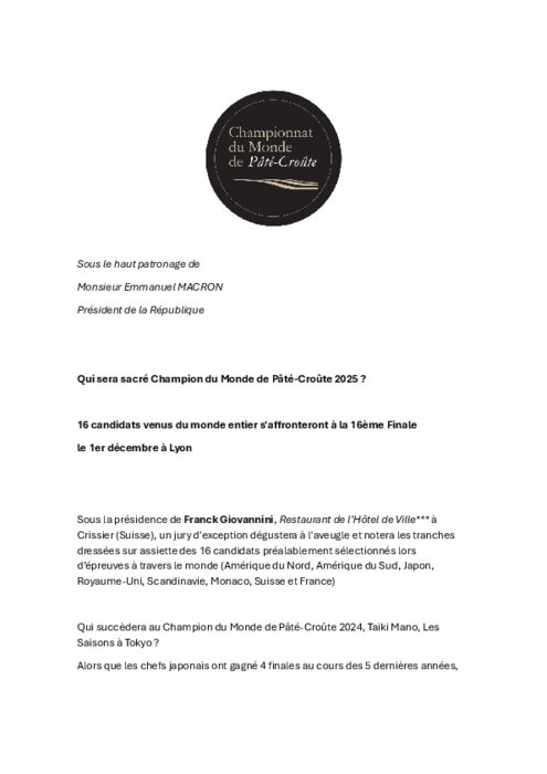 Sous la présidence de Franck Giovannini, Restaurant de l’Hôtel de Ville à Crissier (Suisse), un jury d'exception dégustera à l'aveugle et notera les tranches dressées sur assiette des 16 candidats préalablement sélectionnés lors d’épreuves à travers le monde (Amérique du Nord, Amérique du Sud, Japon, Royaume-Uni, Scandinavie, Monaco, Suisse et France) .