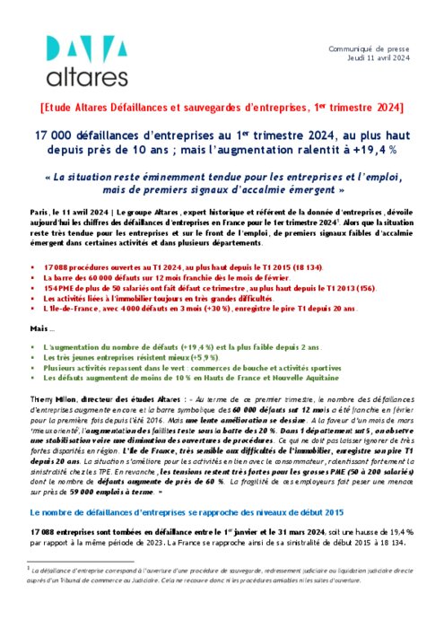 Thierry Millon, directeur des études Altares : "Au terme de ce premier trimestre, le nombre des défaillances d'entreprises augmente encore et la barre symbolique des 60 000 défauts sur 12 mois a été franchie en février pour la première fois depuis l'été 2016. Mais une lente amélioration se dessine. A la faveur d’un mois de mars ‘mieux orienté’, l’augmentation des faillites reste sous la barre des 20 %. Dans 1 département sur 5, on observe une stabilisation voire une diminution des ouvertures de procédures. Ce qui ne doit pas laisser ignorer de très fortes disparités en région. L’Ile de France, très sensible aux difficultés de l’immobilier, enregistre son pire T1 depuis 20 ans".