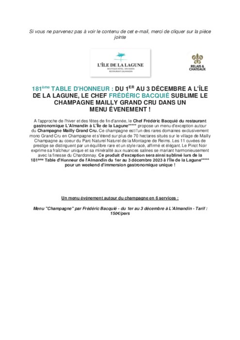 Restauration commerciale 14 novembre 2023 - 14:36 A l'approche de l'hiver et des fêtes de fin d'année, le Chef Frédéric Bacquié du restaurant gastronomique L'Almandin à L'Île de la Lagune propose un menu d'exception autour du Champagne Mailly Grand Cru. PDF (229 Ko) Télécharger