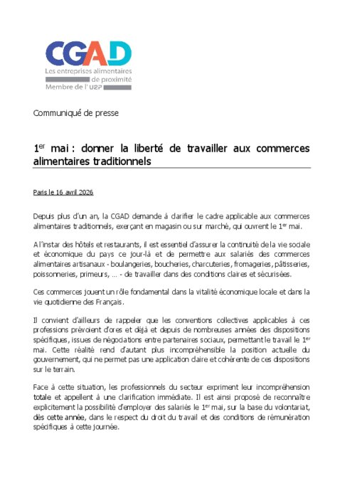 Depuis plus d’un an, la CGAD demande à clarifier le cadre applicable aux commerces alimentaires traditionnels, exerçant en magasin ou sur marché, qui ouvrent le 1er mai. A l’instar des hôtels et restaurants, il est essentiel d’assurer la continuité de la vie sociale et économique du pays ce jour-là et de permettre aux salariés des commerces alimentaires artisanaux - boulangeries, boucheries, charcuteries, fromageries, pâtisseries, poissonneries, primeurs, … - de travailler dans des conditions claires et sécurisées.