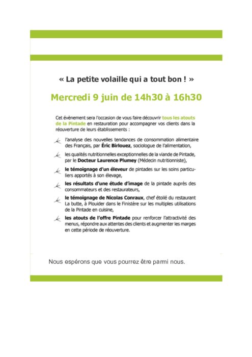 Métiers 27 mai 2021 - 11:17 Jean-Louis Zwick, Président du CIP-PINTADE et les professionnels de la filière Pintade Française vous invitent au 1er webinaire professionnel entièrement dédié à "La petite volaille qui a tout bon". PDF (362 Ko) Télécharger