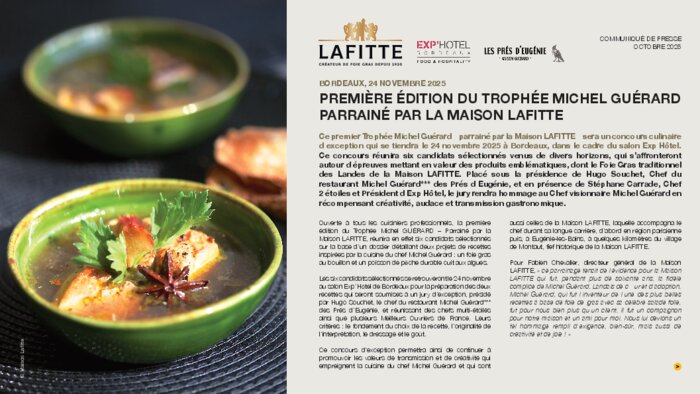 Ce premier Trophée Michel Guérard – parrainé par la Maison Lafitte– sera un concours culinaire d’exception qui se tiendra le 24 novembre 2025 à Bordeaux, dans le cadre du salon Exp’Hôtel. Ce concours réunira six candidats sélectionnés venus de divers horizons, qui s’affronteront autour d’épreuves mettant en valeur des produits emblématiques, dont le Foie Gras traditionnel des Landes de la Maison LAFITTE. Placé sous la présidence de Hugo Souchet, Chef du restaurant Michel Guérard des Prés d’Eugénie, et en présence de Stéphane Carrade, Chef 2 étoiles et Président d’Exp’Hôtel, le jury rendra hommage au Chef visionnaire Michel Guérard en récompensant créativité, audace et transmission gastronomique.