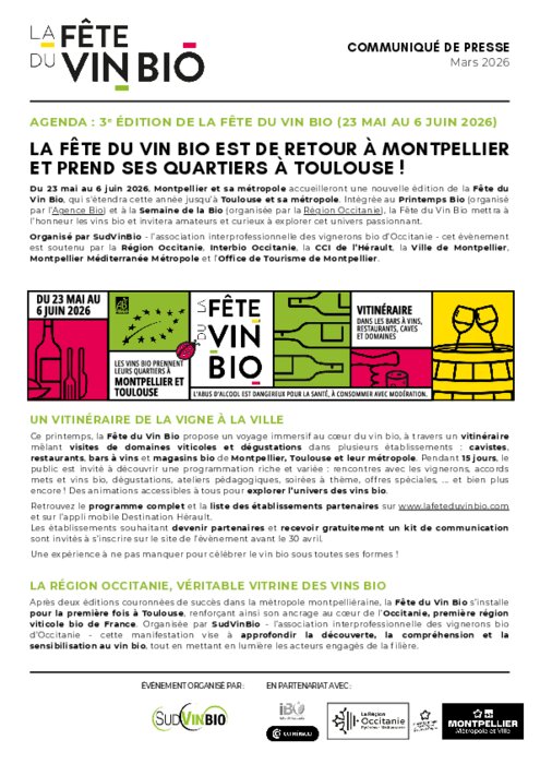 Du 23 mai au 6 juin , Montpellier et sa métropole accueilleront une nouvelle édition de la Fête du Vin Bio, qui s'étendra cette année jusqu’à Toulouse et sa métropole. Intégrée au Printemps Bio (organisé par l’Agence Bio) et à la Semaine de la Bio (organisée par la Région Occitanie), la Fête du Vin Bio mettra à l’honneur les vins bio et invitera amateurs et curieux à explorer cet univers passionnant.