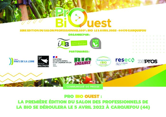 Les deux associations interprofessionnelles Bio, Initiative Bio Bretagne et INTERBIO Pays de la Loire, regroupent leurs énergies pour proposer un événement de rencontres professionnelles dans l’Ouest : le salon professionnel « Pro Bio Ouest ». 70 exposants certifiés Bio de Bretagne et des Pays de la Loire présenteront leurs produits bio alimentaires le 5 avril prochain au Centre des Congrès de la Fleuriaye, à proximité de Nantes (Carquefou, 44).