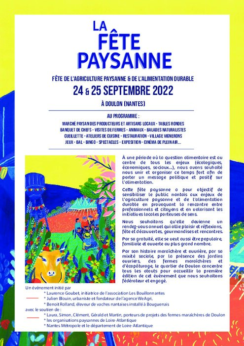 Initiée par Laurence Goubet (les Bouillonnantes), Benot Rolland (éleveur de vache nantaise) et Julien Blouin (WeAgri), la 1ère édition de La Fête Paysanne aura lieu les 24 et 25 septembre à Doulon (Nantes) sur le site de l'ITEP de Moissons Nouvelles.
