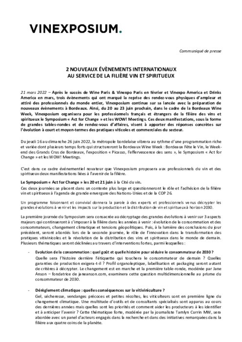Après le succès de Wine Paris & Vinexpo Paris en février et Vinexpo America et Drinks America en mars, trois évènements qui ont marqué la reprise des rendez-vous physiques d’ampleur et attiré des professionnels du monde entier, Vinexposium continue sur sa lancée avec la préparation de nouveaux évènements à Bordeaux.