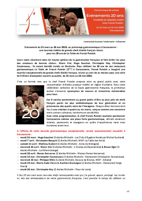 Leurs noms résonnent dans les hautes sphères de la gastronomie française et font briller les yeux des amateurs de bonnes chères : Glenn Viel, Hugo Souchet, Christophe Hay, Christopher Coutenceau… Ils seront bientôt invités en Occitanie. Pour célébrer les 20 ans de son restaurant gastronomique La Table de Franck Putelat à Carcassonne, Franck Putelat a imaginé une tournée exceptionnelle de grands chefs étoilés français, réunis au sein de sa maison pour une série de 9 dîners d’exception ouverts au public, du 31 mars au 26 mai .