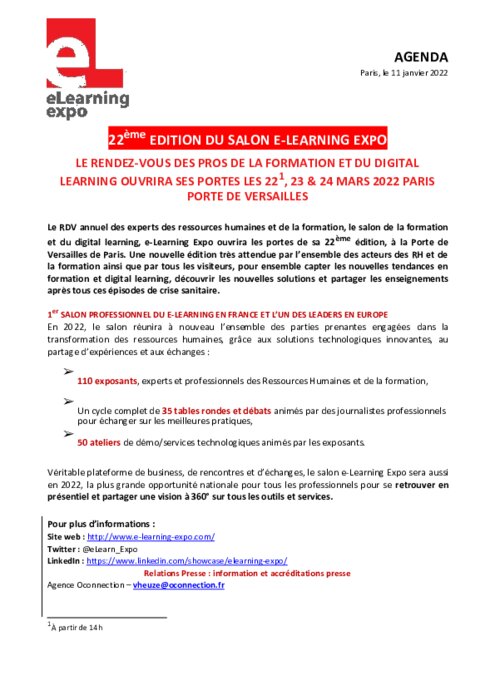 Métiers 11 janvier 2022 - 08:31 Le RDV annuel des experts des ressources humaines et de la formation, le salon de la formation et du digital learning, e-Learning Expo ouvrira les portes de sa 22ème édition, à la Porte de Versailles de Paris. PDF (146 Ko) Télécharger