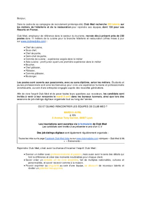 Dans le cadre de sa campagne de recrutement printemps-été, Club Med recherche 230 talents sur les métiers de l’hôtellerie et de la restauration pour rejoindre ses équipes, dont 130 pour ses Resorts en France. Club Med, employeur de référence dans le secteur du tourisme, recrute dès à présent près de 230 postes dans 11 métiers de la cuisine pour la branche hôtellerie et restauration (offres mises à jour sur www.clubmedjobs.com) .