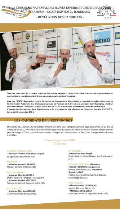 Métiers 12 octobre 2021 - 15:11 Tous les deux ans, le concours national des jeunes espoirs et chefs charcutier traiteur vise à promouvoir et encourager le travail des salariés des entreprises artisanales françaises. PDF (397 Ko) Télécharger