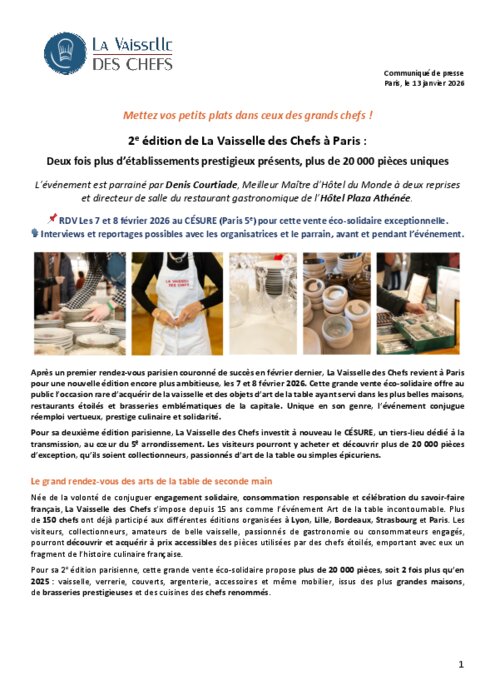 Après une première édition parisienne couronnée de succès, La Vaisselle des Chefs revient en 2026 avec une édition encore plus ambitieuse. Cette grande vente éco-solidaire offre au public l’occasion rare d’acquérir de la vaisselle, de la verrerie, des couverts, de l’argenterie, des accessoires ou encore du mobilier ayant servi dans les plus belles maisons, restaurants étoilés et brasseries emblématiques de la capitale.