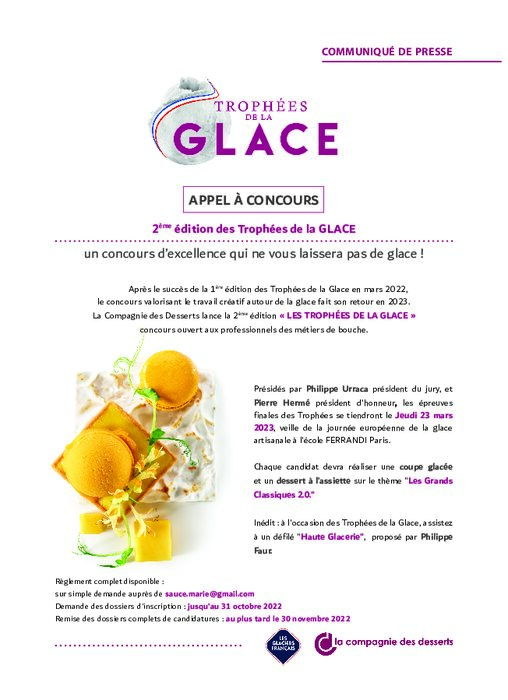 Métiers 30 juin 2022 - 14:34 Le concours est ouvert aux professionnels des métiers de bouche. Sur le thème des Grands Classiques 2.0, chaque candidat devra réaliser une coupe glacée et un dessert à l’assiette autour d'une glace. PDF (2 Mo) Télécharger