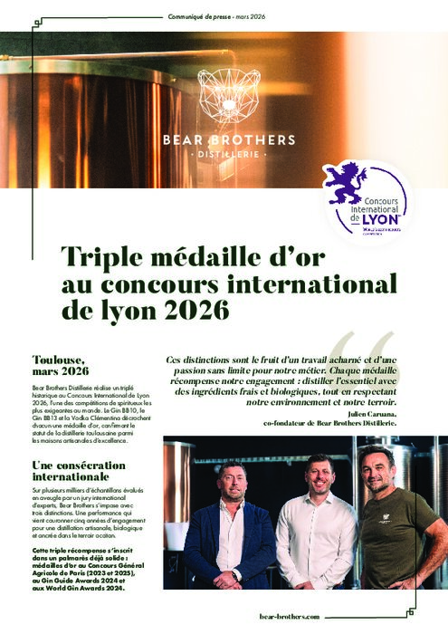 Bear Brothers Distillerie réalise un triplé historique au Concours International de Lyon 2026. Le Gin BB10, le Gin BB13 et la Vodka Clémentina décrochent chacun une médaille d’or, confirmant le statut de la distillerie toulousaine parmi les maisons artisanales d’excellence.