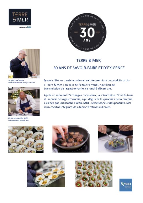 Fournisseurs 06 décembre 2022 - 16:34 Sysco a fêté les trente ans de sa marque premium de produits bruts « Terre & Mer » au sein de l’école Ferrandi, haut lieu de transmission de la gastronomie. PDF (571 Ko) Télécharger