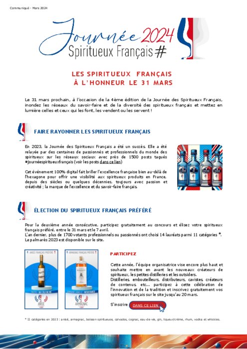 En 2023, la Journée des Spiritueux Français a été un succès. Elle a été relayée par des centaines de passionnés et professionnels du monde des spiritueux sur les réseaux sociaux avec près de 1500 posts tagués #journéespiritueuxfrançais. Cet événement 100% digital fait briller l’excellence française bien au-delà de l’hexagone pour offrir une visibilité aux spiritueux produits en France, depuis des siècles ou quelques décennies, toujours avec passion et créativité ; la marque de l’excellence et du savoir-faire français.