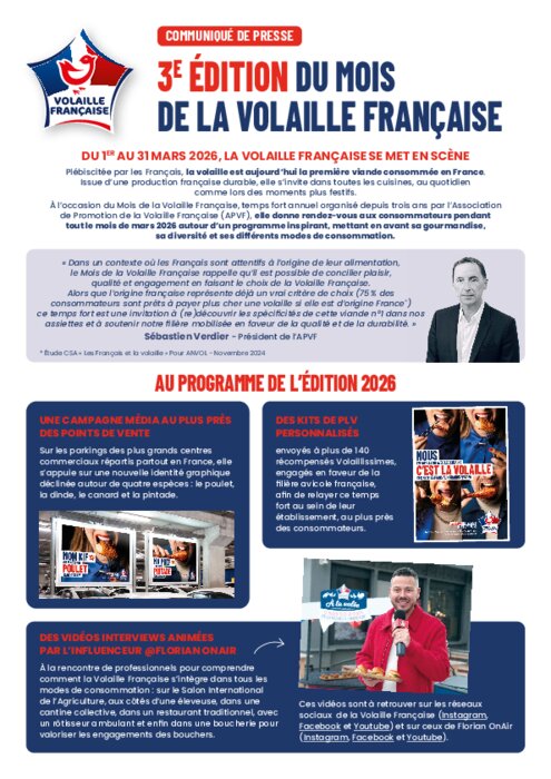 À l’heure où l’origine France reste un critère d’achat structurant pour les consommateurs (75 % se déclarent prêts à payer plus cher une volaille d’origine France), l’Association de Promotion de la Volaille Française (APVF) lance en ce début du mois de mars la 3e édition du Mois de la Volaille Française, temps fort devenu au fil du temps un levier de valorisation de la Volaille Française auprès des consommateurs, associant filière, distributeurs et restaurateurs.