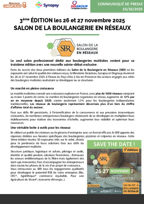 Forts du succès des deux premières éditions du Salon de la Boulangerie en Réseaux (SBR) où les exposants ont salué la qualité des visiteurs reçus, la Minoterie Girardeau, Synapsy et Disgroup réuniront les 26 et 27 novembre à l'Arena du Pays d'Aix à Aix-en-Provence des acteurs engagés aux côtés des boulangers multisites souhaitant se développer ou se structurer.