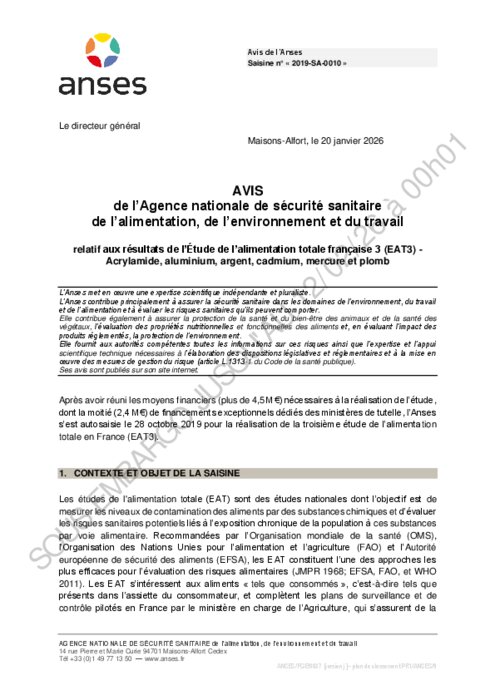 Les études de l'alimentation totale (EAT) sont des études nationales dont l’objectif est de mesurer les niveaux de contamination des aliments par des substances chimiques et d’évaluer les risques sanitaires potentiels liés à l’exposition chronique de la population à ces substances par voie alimentaire. Recommandées par l’Organisation mondiale de la santé (OMS), l’Organisation des Nations Unies pour l’alimentation et l’agriculture (FAO) et l’Autorité européenne de sécurité des aliments (EFSA), les EAT constituent l’une des approches les