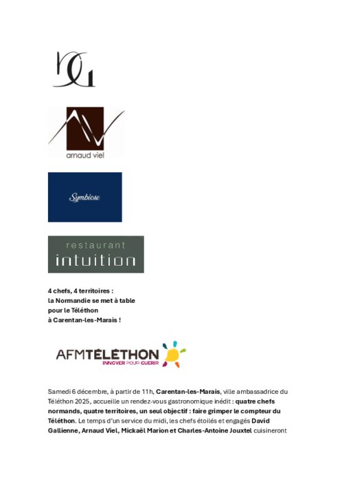 Samedi 6 décembre, à partir de 11h, Carentan-les-Marais, ville ambassadrice du Téléthon 2025, accueille un rendez-vous gastronomique inédit : quatre chefs normands, quatre territoires, un seul objectif : faire grimper le compteur du Téléthon. Le temps d’un service du midi, les chefs étoilés et engagés David Gallienne, Arnaud Viel, Mickaël Marion et Charles-Antoine Jouxtel cuisineront chacun un plat signature, proposé en une centaine d’assiettes, dont l’intégralité des ventes sera reversée au Téléthon.