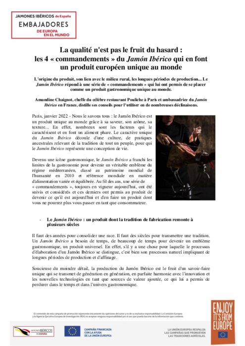 Fournisseurs 06 janvier 2023 - 14:24 Le Jamón Ibérico est un produit unique au monde grâce à sa saveur, son arôme, sa texture. PDF (540 Ko) Télécharger