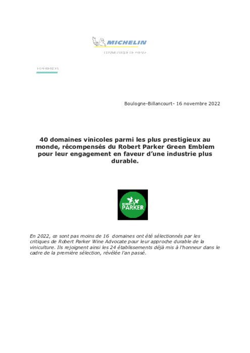 En 2022, ce sont pas moins de 16 domaines ont été sélectionnés par les critiques de Robert Parker Wine Advocate pour leur approche durable de la viniculture. Ils rejoignent ainsi les 24 établissements déjà mis à l'honneur dans le cadre de la première sélection, révélée l'an passé.
