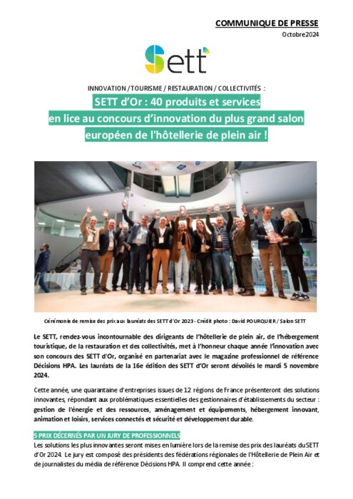 Le SETT, rendez-vous incontournable des dirigeants de l’hôtellerie de plein air, de l’hébergement touristique, de la restauration et des collectivités, met à l’honneur chaque année l’innovation avec son concours des SETT d'Or, organisé en partenariat avec le magazine professionnel de référence Décisions HPA. Les lauréats de la 16e édition des SETT d’Or seront dévoilés le mardi 5 novembre.