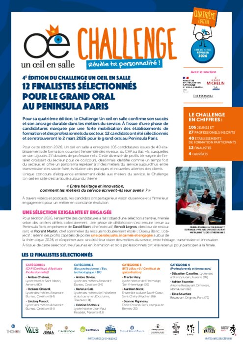 Pour sa quatrième édition, le Challenge Un œil en salle confirme son succès et son ancrage durable dans les métiers du service. À l’issue d’une phase de candidatures marquée par une forte mobilisation des établissements de formation et des professionnels du secteur, 12 candidats ont été sélectionnés et se retrouveront le 2 mars pour le grand oral au Peninsula Paris.