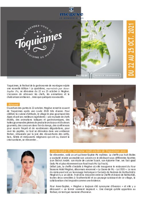 Toquicimes, le festival de la gastronomie de montagne mijote une nouvelle édition ! La quatrième, marrainée par Anne- Sophie Pic, se déroulera du 22 au 25 octobre à Megève. L’occasion de retrouver les chefs, les animations et la chaleureuse ambiance… Ainsi que quelques nouveautés.