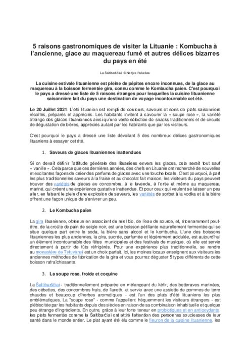 La glace au maquereau fumé, la gira, boisson pétillante à l’arôme de bière, les concombres tout justes cueillis, glacés au miel, ce ne sont là que quelques-uns des délices qui, bien qu'ils puissent paraître curieux aux étrangers, sont des plats de base pour les lituaniens en été.