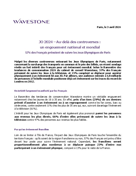 57% des Français prévoient de suivre les Jeux Olympiques de Paris (Etude Wavestone)