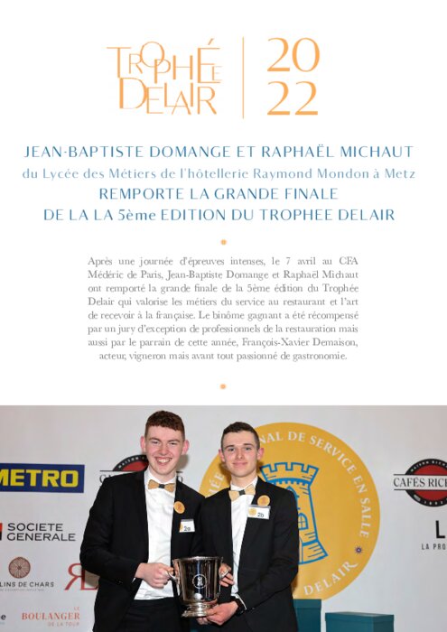Après une journée d’épreuves intenses, le 7 avril au CFA Médéric de Paris, Jean-Baptiste Domange et Raphaël Michaut ont remporté la grande finale de la 5ème édition du Trophée Delair qui valorise les métiers du service au restaurant et l’art de recevoir à la française. Le binôme gagnant a été récompensé par un jury d’exception de professionnels de la restauration mais aussi par le parrain de cette année, François-Xavier Demaison.