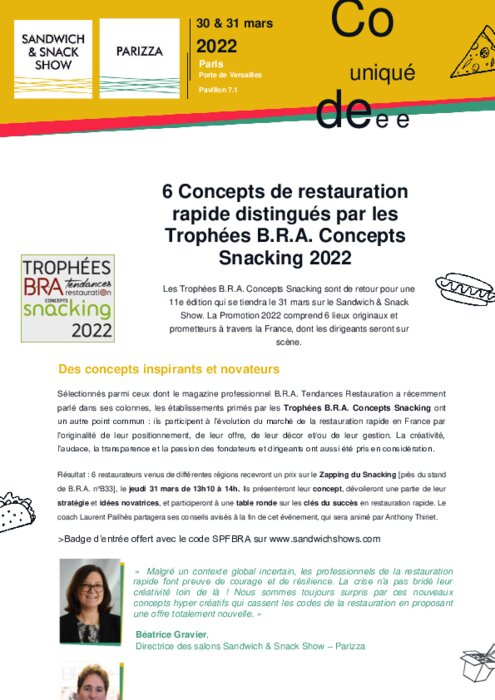 Métiers 17 mars 2022 - 09:50 Les Trophées B.R.A. Concepts Snacking sont de retour pour une 11e édition qui se tiendra le 31 mars sur le Sandwich & Snack Show. La Promotion 2022 comprend 6 lieux originaux et prometteurs à travers la France, dont les dirigeants seront sur scène. PDF (578 Ko) Télécharger