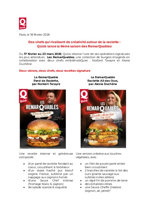 Snacking 19 février 2026 - 09:36 Jusqu'au 23 mars, Quick relance l’une de ses opérations signatures les plus attendues : Les RemarQuables, une collection de burgers imaginés en collaboration avec deux chefs emblématiQues : Norbert Tarayre et Alexia Duchêne. PDF (248 Ko) Télécharger