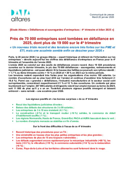 L’année 2025 se conclut sur des seuils de défaillances encore record. Avec 19 024 procédures ouvertes sur le dernier trimestre, le pic des 70 000 défaillances - sauvegardes, redressements et liquidations judiciaires - est quasi atteint. Si la hausse des faillites se poursuit, son rythme ralentit : + 1,7 % au 4ème trimestre contre + 10 % en 2024 et + 38 % en 2023 sur la même période. Les tensions restent cependant très fortes pour les organisations d’au moins 100 salariés. Le nombre d’ouvertures est au plus haut (236 sur l’année) et continue d’accélérer très fortement (+ 18,6 %). Parmi ces « grandes » défaillances, l’industrie manufacturière et le secteur social sont surreprésentés, concentrant respectivement 21 % et 12 % des ouvertures.