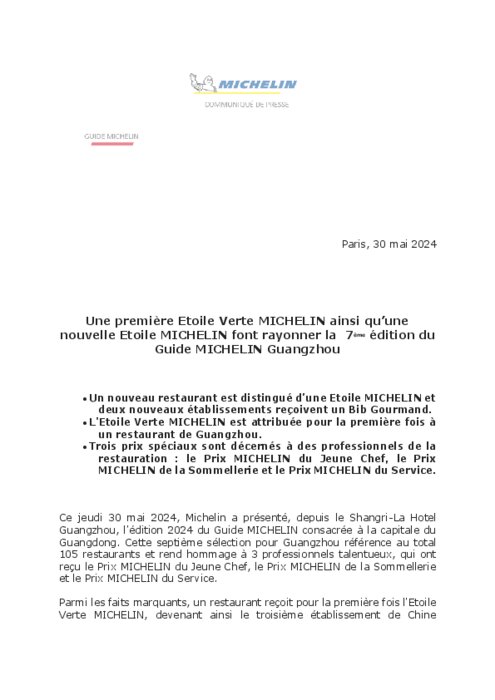 Parmi les faits marquants, un restaurant reçoit pour la première fois l'Etoile Verte Michelin , devenant ainsi le troisième établissement de Chine continentale à voir ses engagements durables récompensés. Un nouvel établissement décroche une première Etoile Michelin .