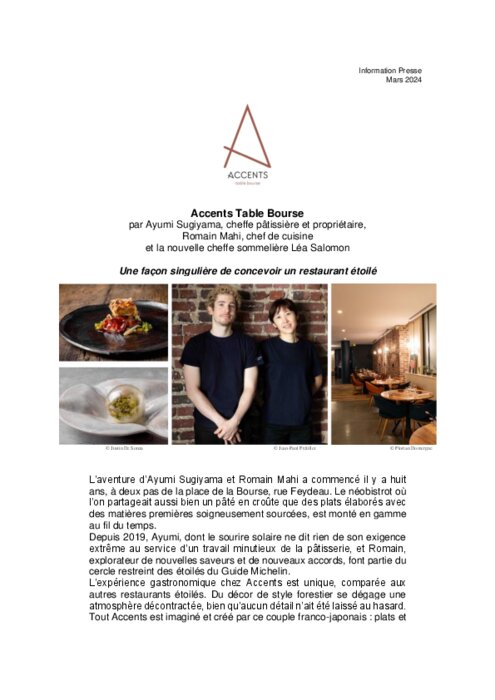 L’aventure d’Ayumi Sugiyama et Romain Mahi a commencé il y a huit ans, à deux pas de la place de la Bourse, rue Feydeau. Le néobistrot où l’on partageait aussi bien un pâté en croûte que des plats élaborés avec des matières premières soigneusement sourcées, est monté en gamme au fil du temps.