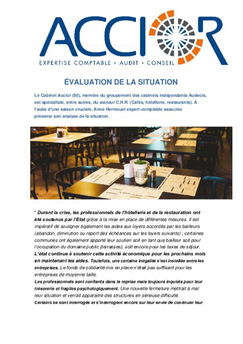 Le Cabinet Accior (85), membre du groupement des cabinets indépendants Audecia, est spécialiste, entre autres, du secteur C.H.R. (Cafés, hôtellerie, restaurants). À l'aube d'une saison cruciale, Anne Hermouet expert-comptable associée présente son analyse de la situation.