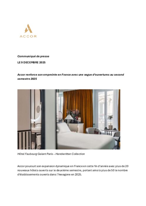 Restauration commerciale 10 décembre 2025 - 06:25 Accor poursuit son expansion dynamique en France en cette fin d’année avec plus de 20 nouveaux hôtels ouverts sur le deuxième semestre, portant ainsi à plus de 50 le nombre d’établissements ouverts dans l’hexagone en 2025. PDF (235 Ko) Télécharger credit Hôtel Faubourg Galant Paris – Handwritten Collection - Accor