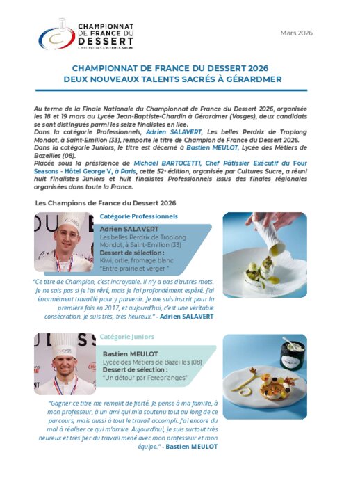 Au terme de la Finale Nationale du Championnat de France du Dessert 2026, organisée les 18 et 19 mars au Lycée Jean-Baptiste-Chardin à Gérardmer (Vosges), deux candidats se sont distingués parmi les seize finalistes en lice. Dans la catégorie professionnels, Adrien Salavert, Les belles Perdrix de Troplong Mondot, à Saint-Emilion (33), remporte le titre de Champion de France du Dessert 2026. Dans la catégorie Juniors, le titre est décerné à Bastien Meulot, Lycée des Métiers de Bazeilles (08).