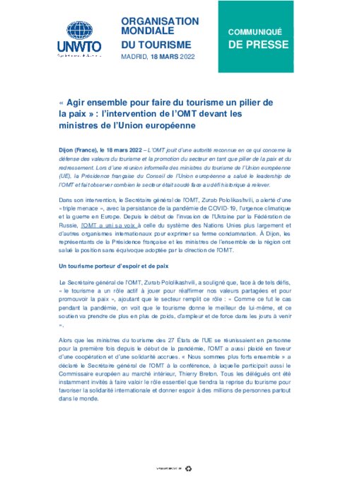Métiers 18 mars 2022 - 17:17 L’OMT jouit d’une autorité reconnue en ce qui concerne la défense des valeurs du tourisme et la promotion du secteur en tant que pilier de la paix et du redressement. PDF (148 Ko) Télécharger