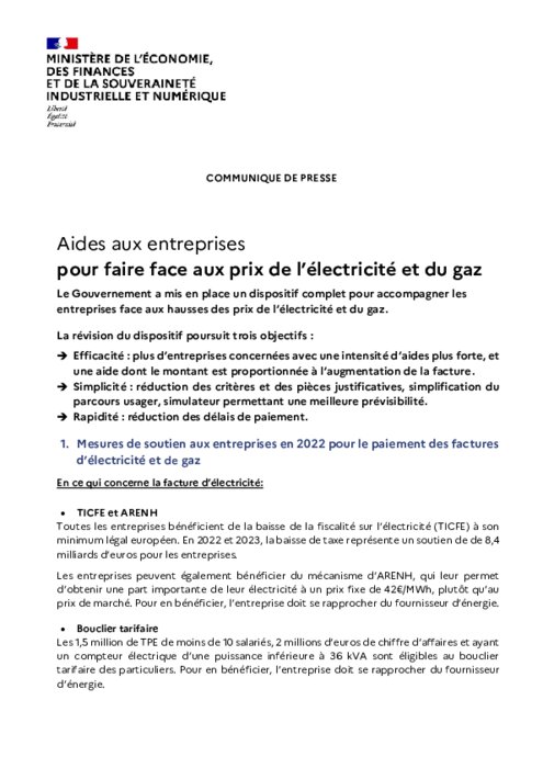 Métiers 19 novembre 2022 - 08:34 Le Gouvernement a mis en place un dispositif complet pour accompagner les entreprises face aux hausses des prix de l’électricité et du gaz. PDF (402 Ko) Télécharger