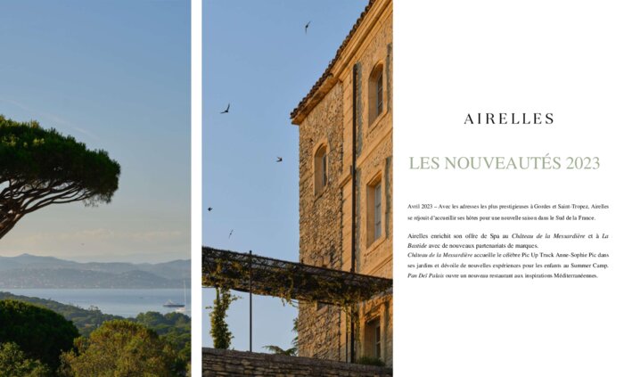 Restauration commerciale 02 mai 2023 - 16:19 Avec les adresses les plus prestigieuses à Gordes et Saint-Tropez, Airelles se réjouit d’accueillir ses hôtes pour une nouvelle saison dans le Sud de la France. PDF (3 Mo) Télécharger