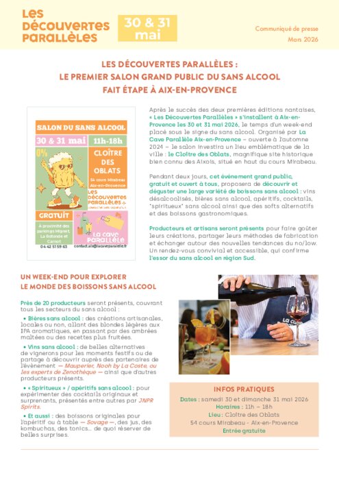 Organisé par La Cave Parallèle Aix-en-Provence – ouverte à l’automne 2024 – le salon investira un lieu emblématique de la ville, le Cloître des Oblats, situé en haut du cours Mirabeau. Pendant deux jours, cet événement grand public, gratuit et ouvert à tous, proposera de découvrir et déguster une large variété de boissons sans alcool : vins désalcoolisés, bières sans alcool, apéritifs, cocktails, “spiritueux” sans alcool ainsi que des softs alternatifs et des boissons gastronomiques. Producteurs et artisans seront présents pour faire goûter leurs créations, partager leurs méthodes de fabrication et échanger autour des nouvelles tendances du no/low.